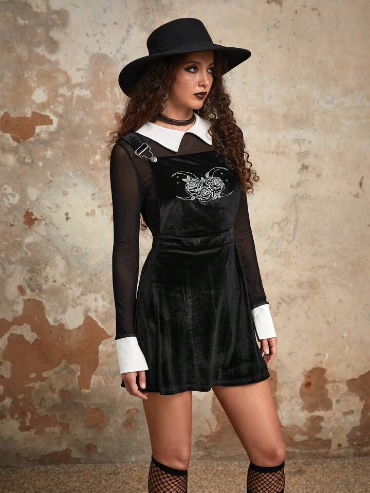 Goth Floral Print Velvet Overall Dress