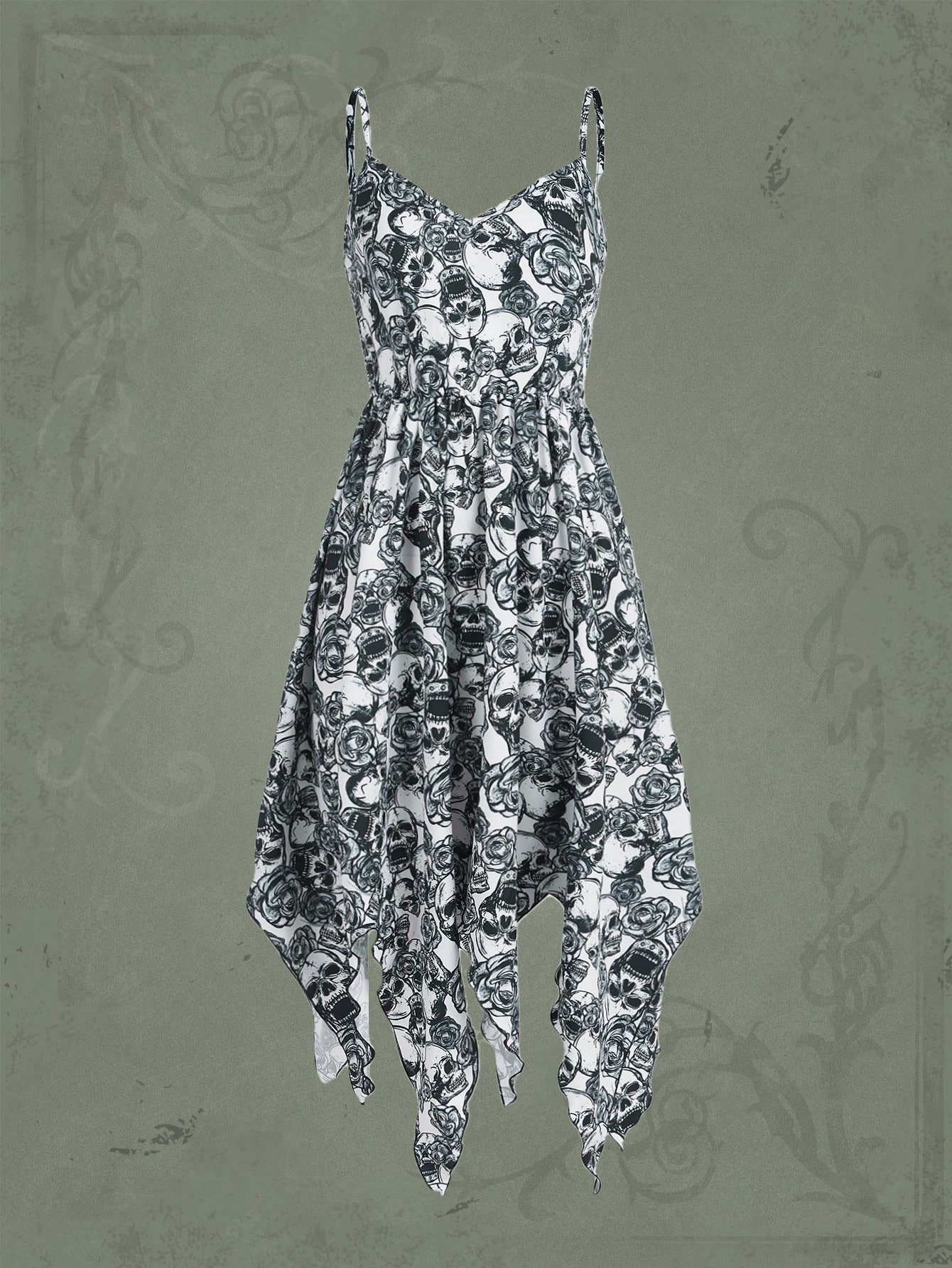 Goth Floral & Skull Print Hanky Hem Cami Dress