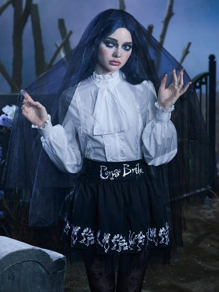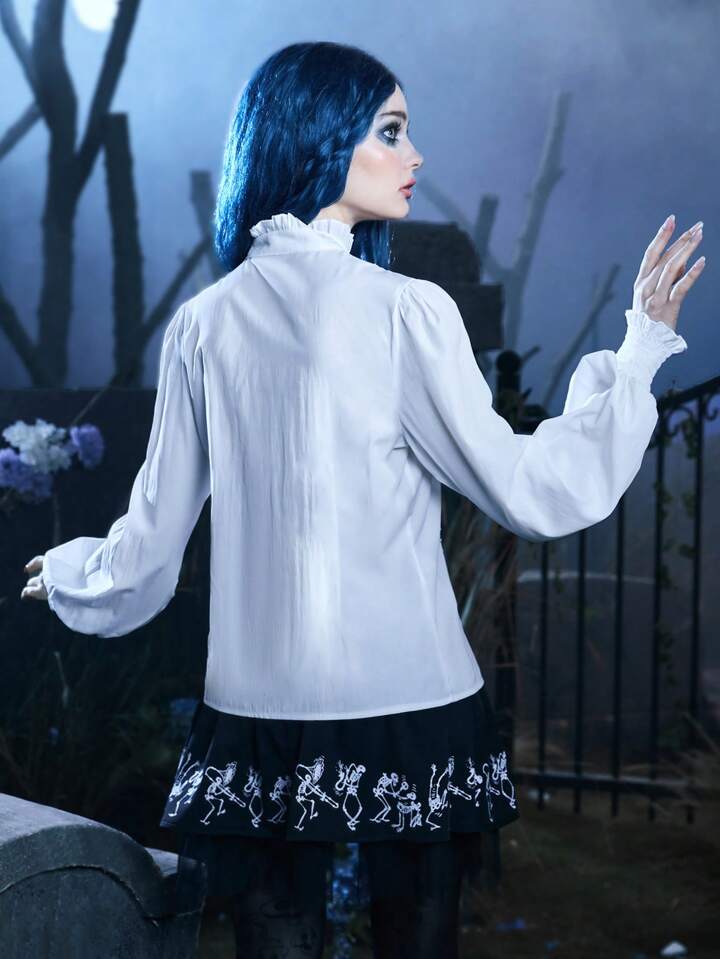 Goth Frill Trim Tie Neck Lantern Sleeve Shirt