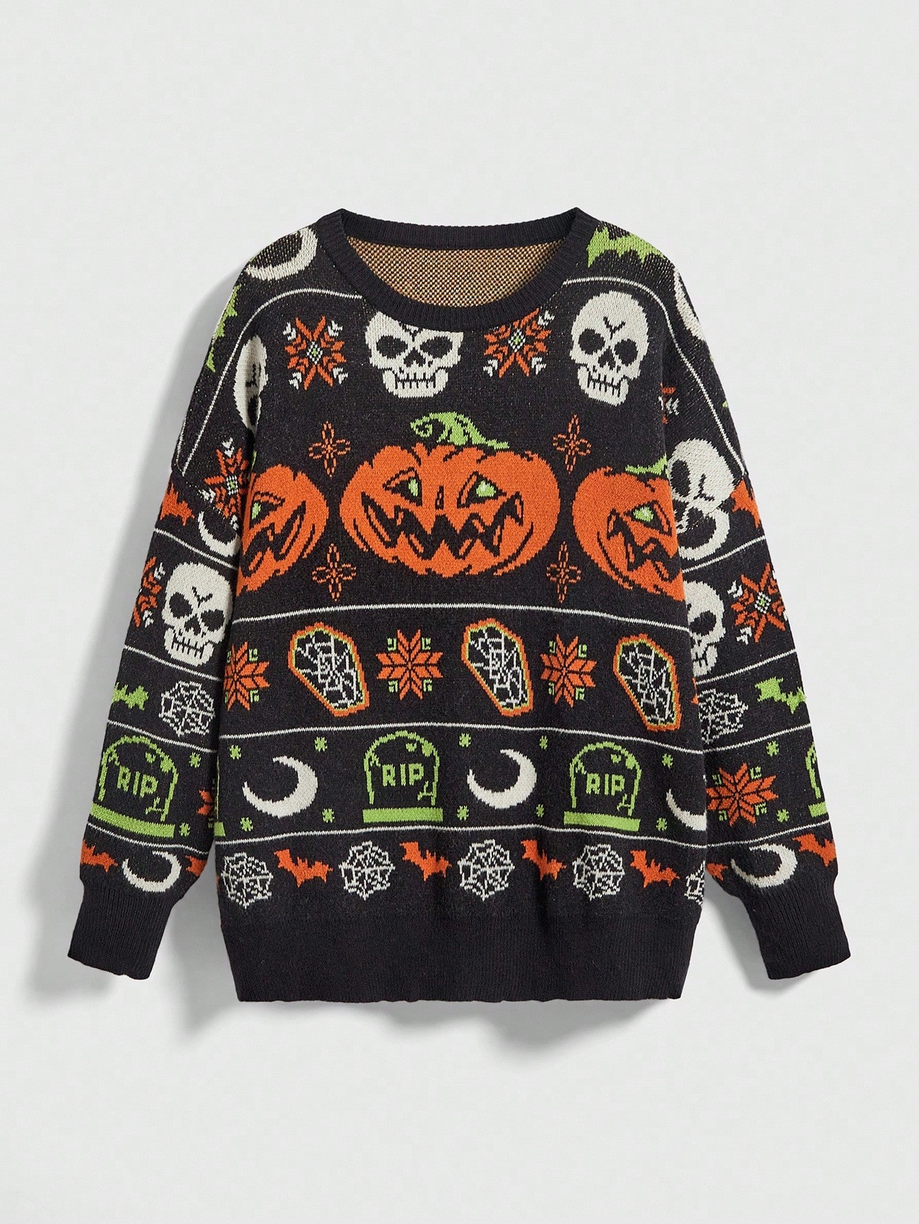 Gothic Halloween Spooky Skull & Pumpkin Colorblock Pullover Sweater
