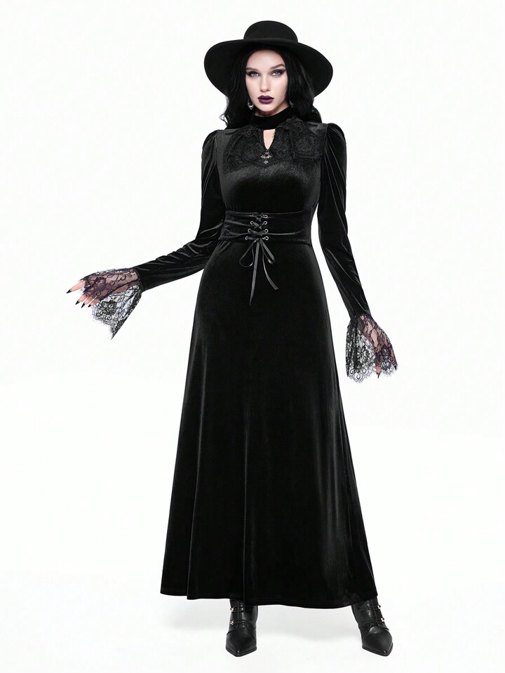 Gothic Vintage Lace And Velvet Patchwork Long Dress For Party, Halloween Events, New Year