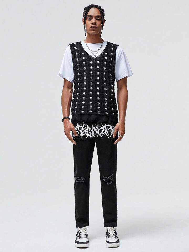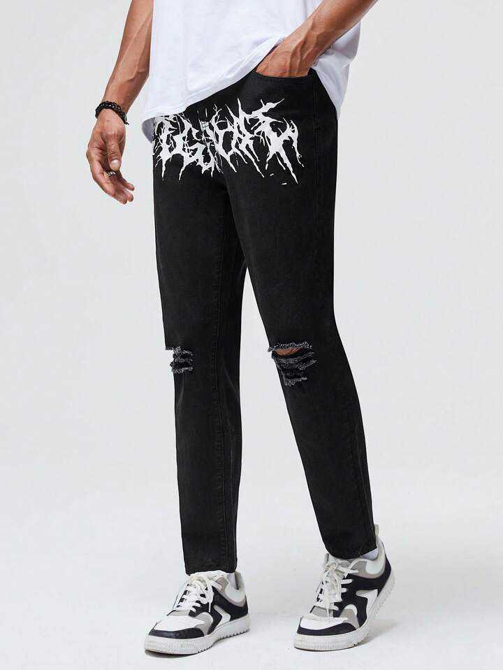 Goth Guys Cotton Letter Graphic Ripped Jeans