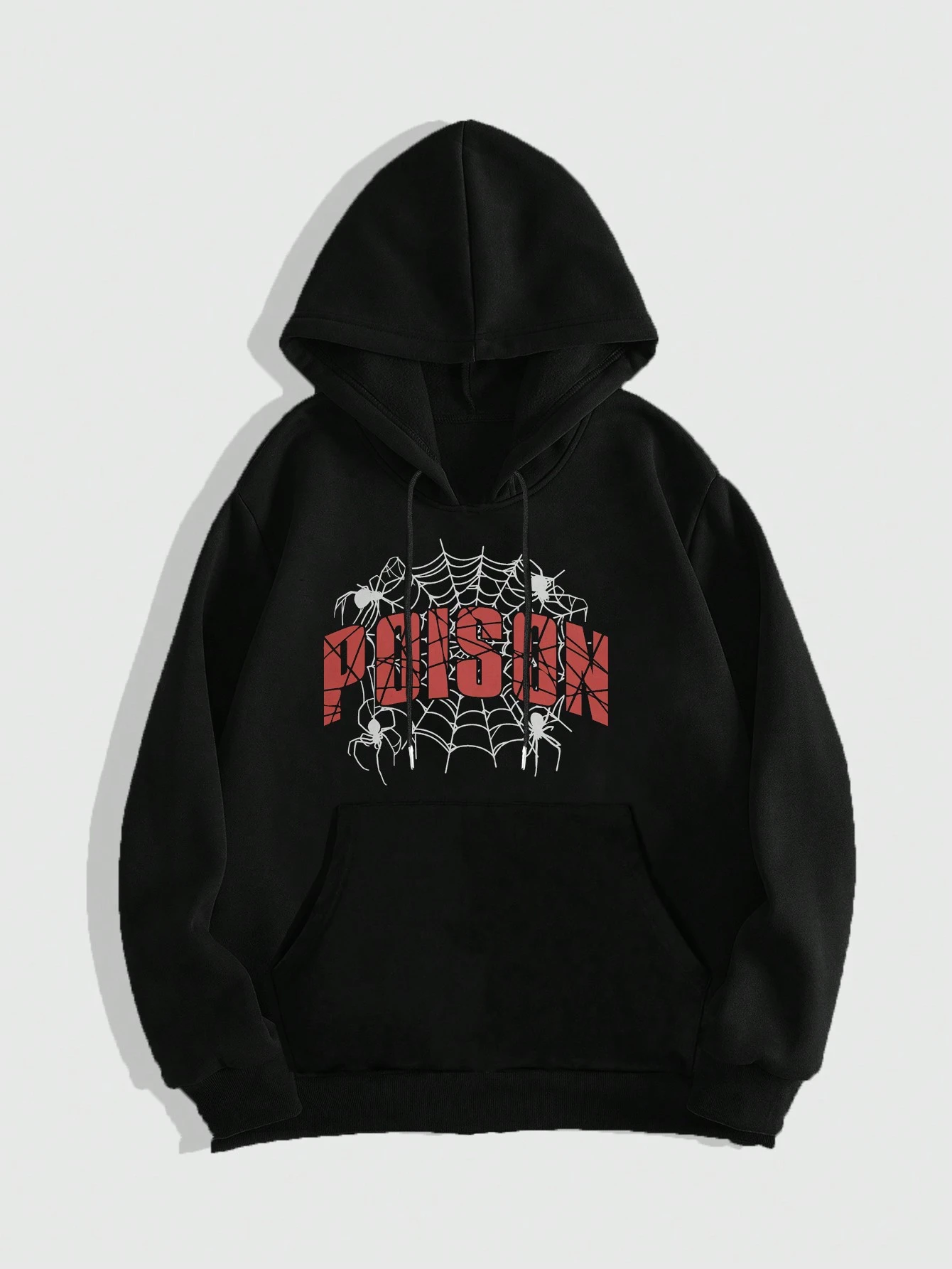 Goth Guys Letter & Spider Graphic Drawstring Hoodie