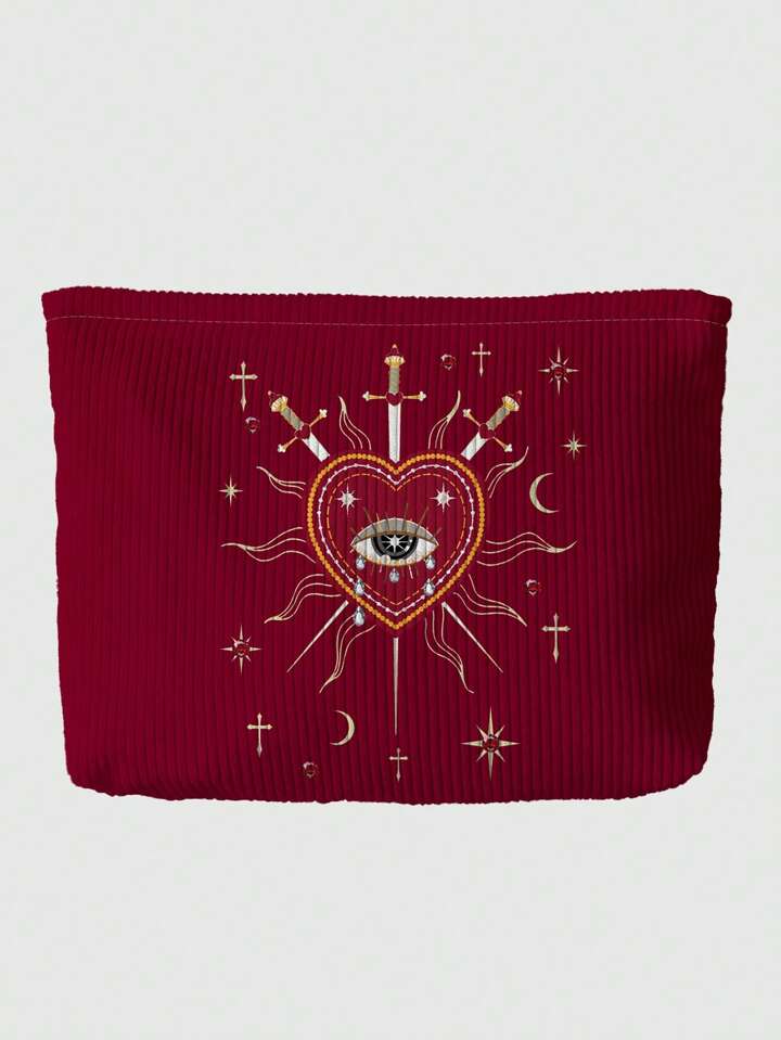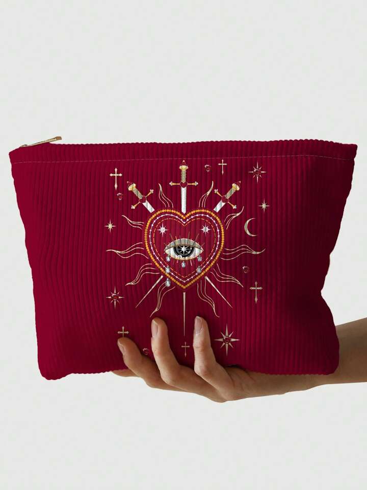 Goth Heart, Eye, Teardrop And Sword Printed Corduroy Zipper Makeup Bag, Lightweight Multifunctional Lined Cosmetic Pouch