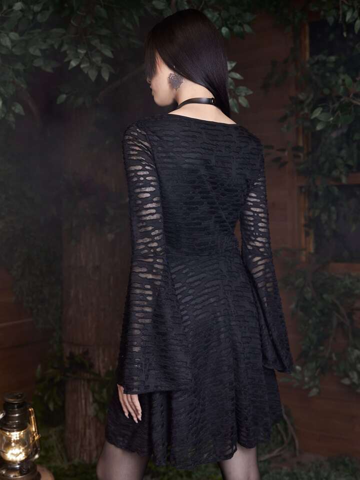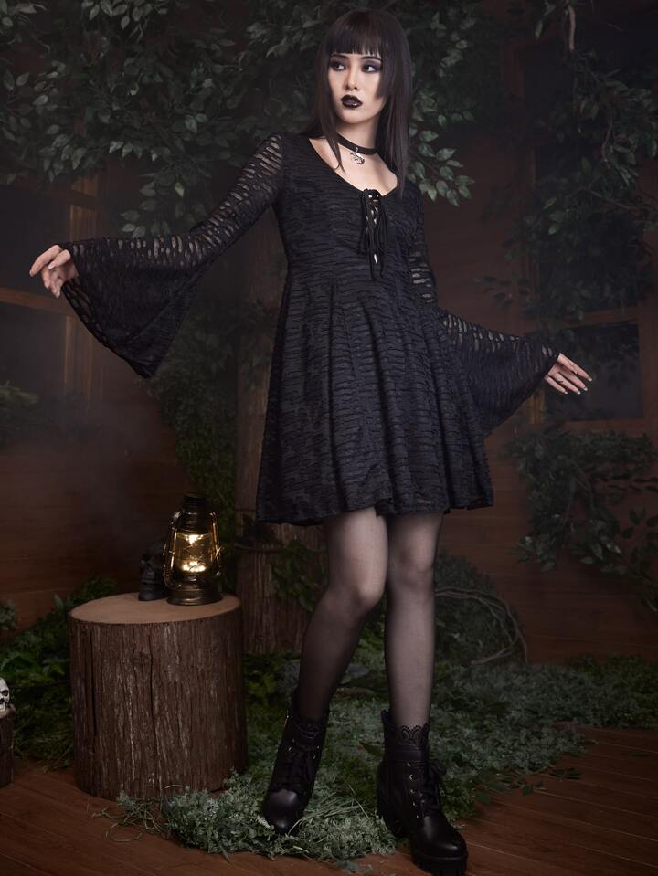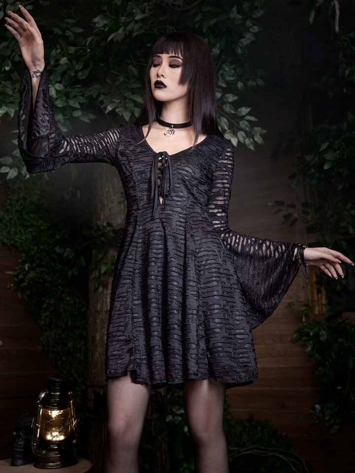Goth Lace Up Textured Bell Sleeve Dress
