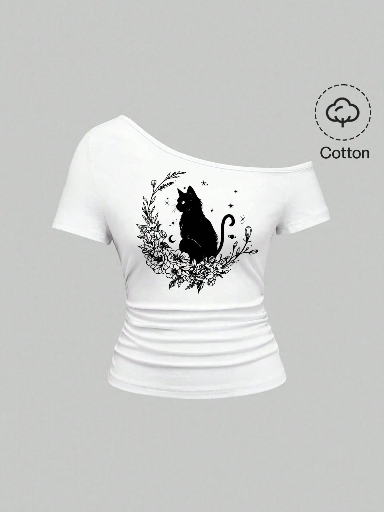 Goth Ladies Cat Witch Leaf Star Moon Graphic T-Shirt