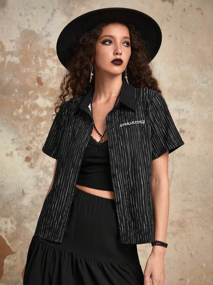 Goth Letter Striped Print Button Front Shirt