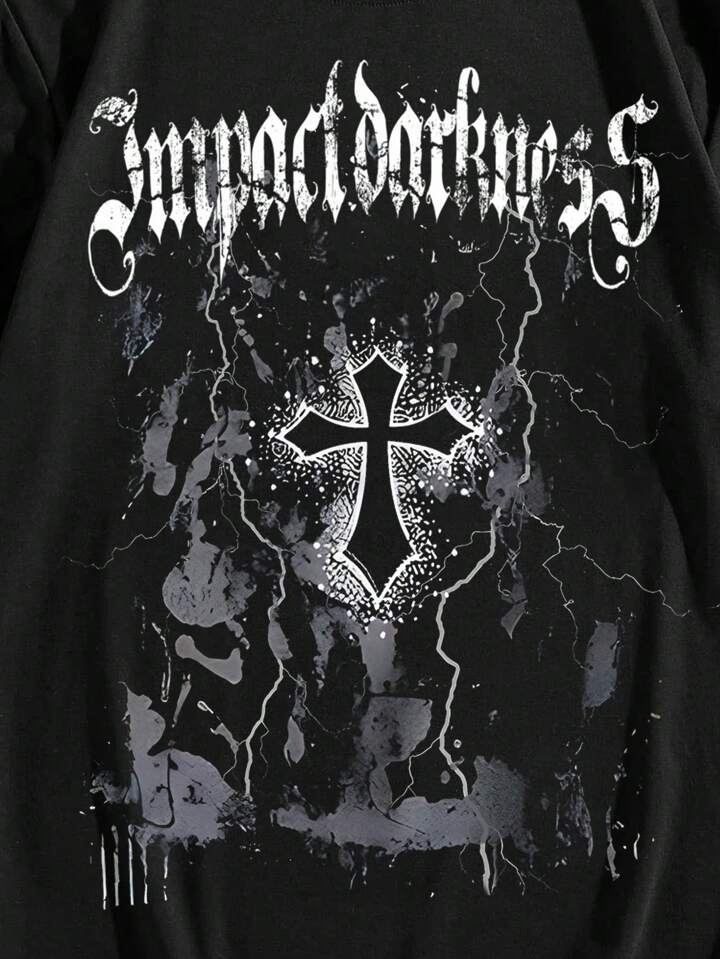 Goth Men Cross Letter Graphic Tee For Halloween, School, 2000s Style