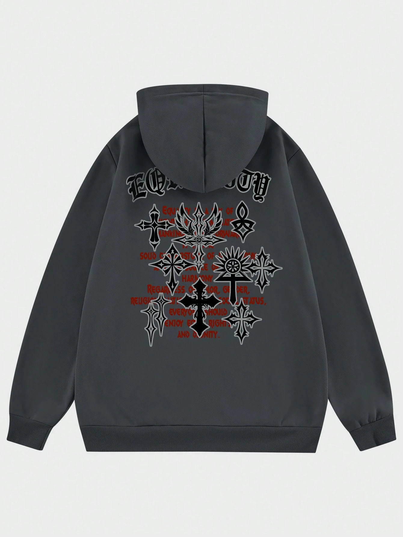 Goth Men Cross & Slogan Printed Zipper Front Drawstring Hoodie