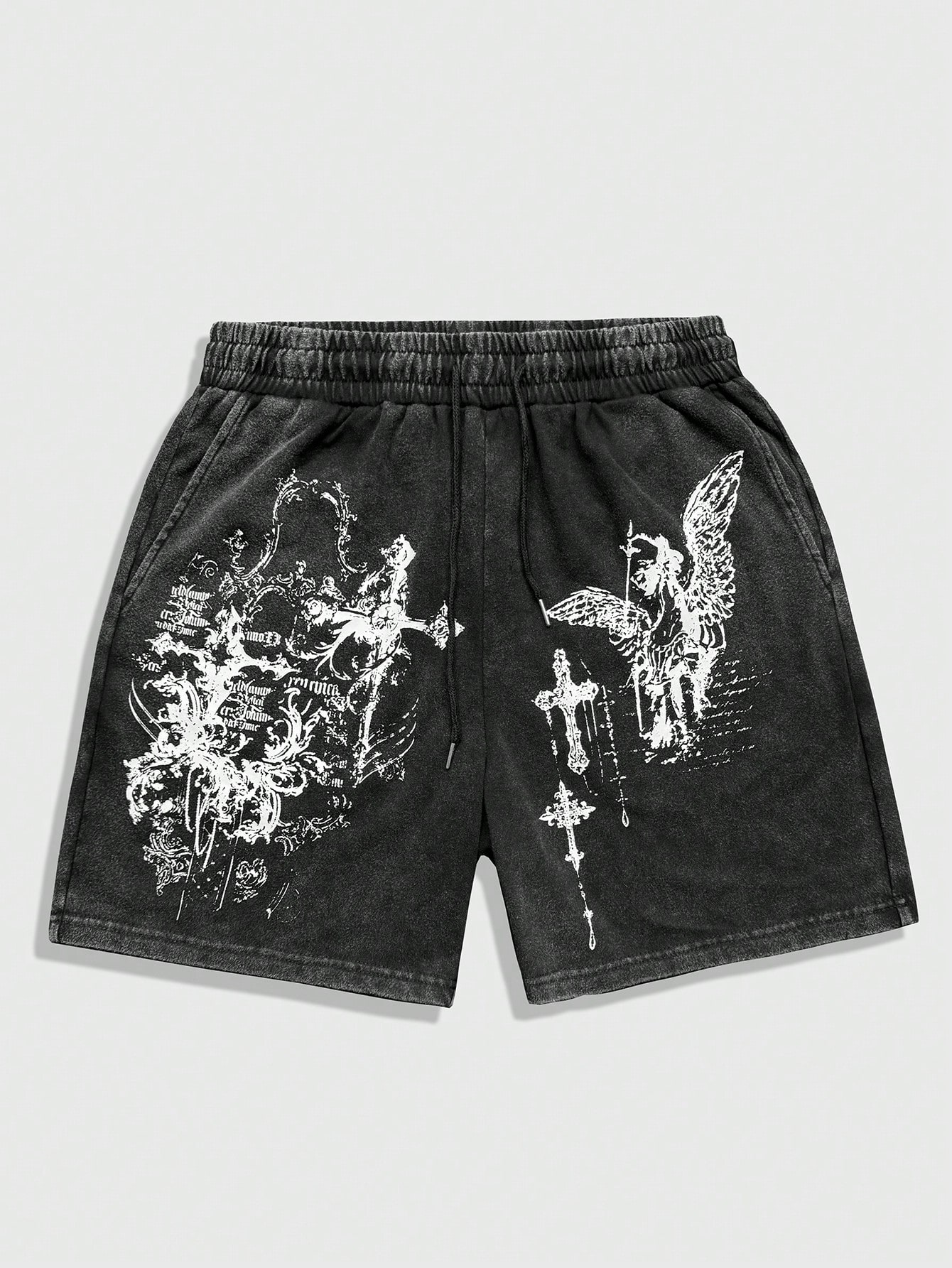 Goth Men's Casual Fashion Street Cross & Slogan Print Drawstring Waist Washed Shorts, Summer