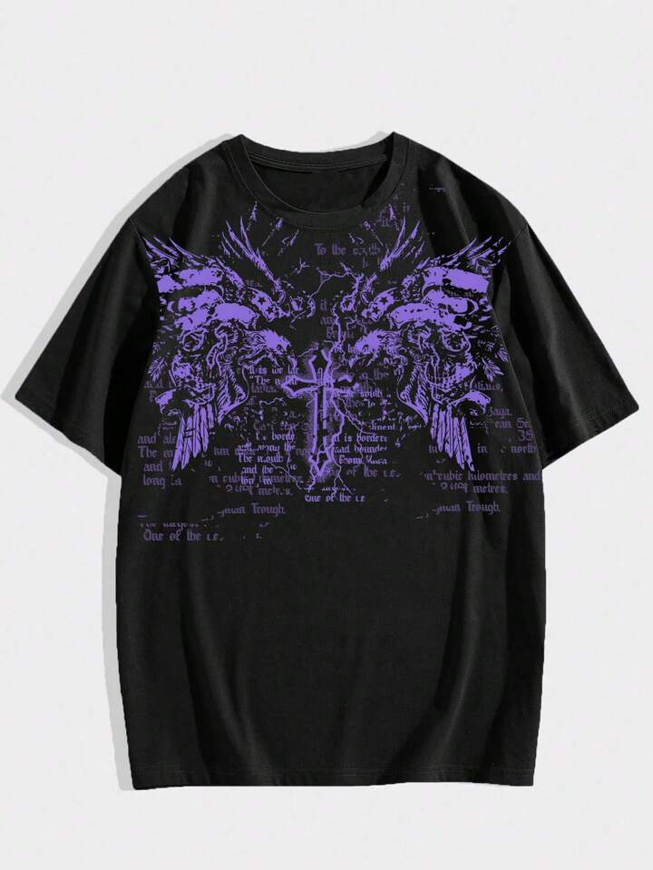 Goth Men's Casual Loose Fit Cross Print Slogan Round Neck Short Sleeve T-Shirt