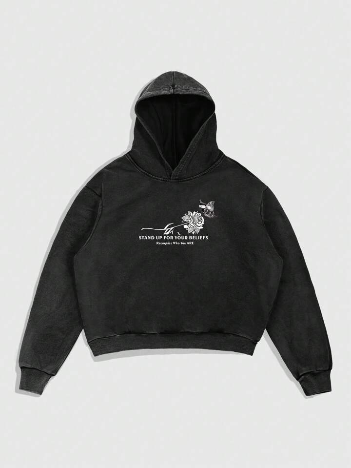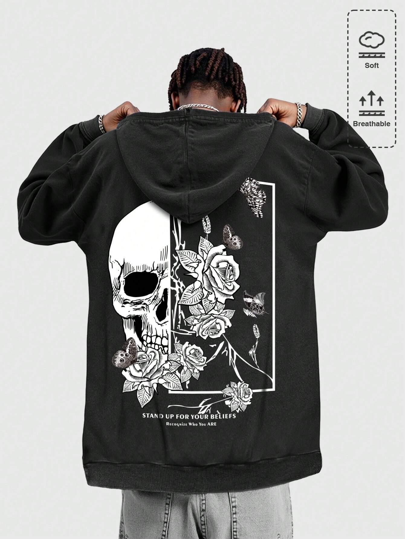Goth Men's Casual Skull & Floral Print Hoodie For Everyday Wear, Autumn