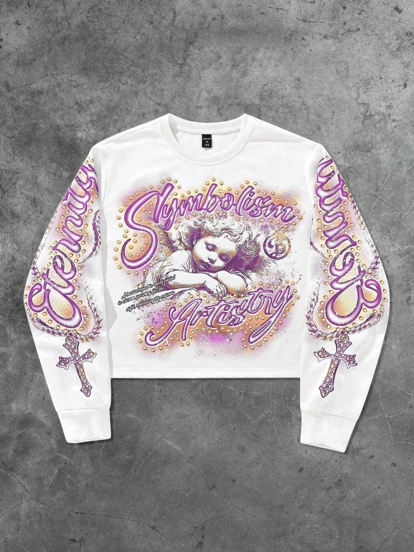 Goth Men's Casual Street Angel Letter Cross Print Cropped Pullover Sweatshirt , Fall