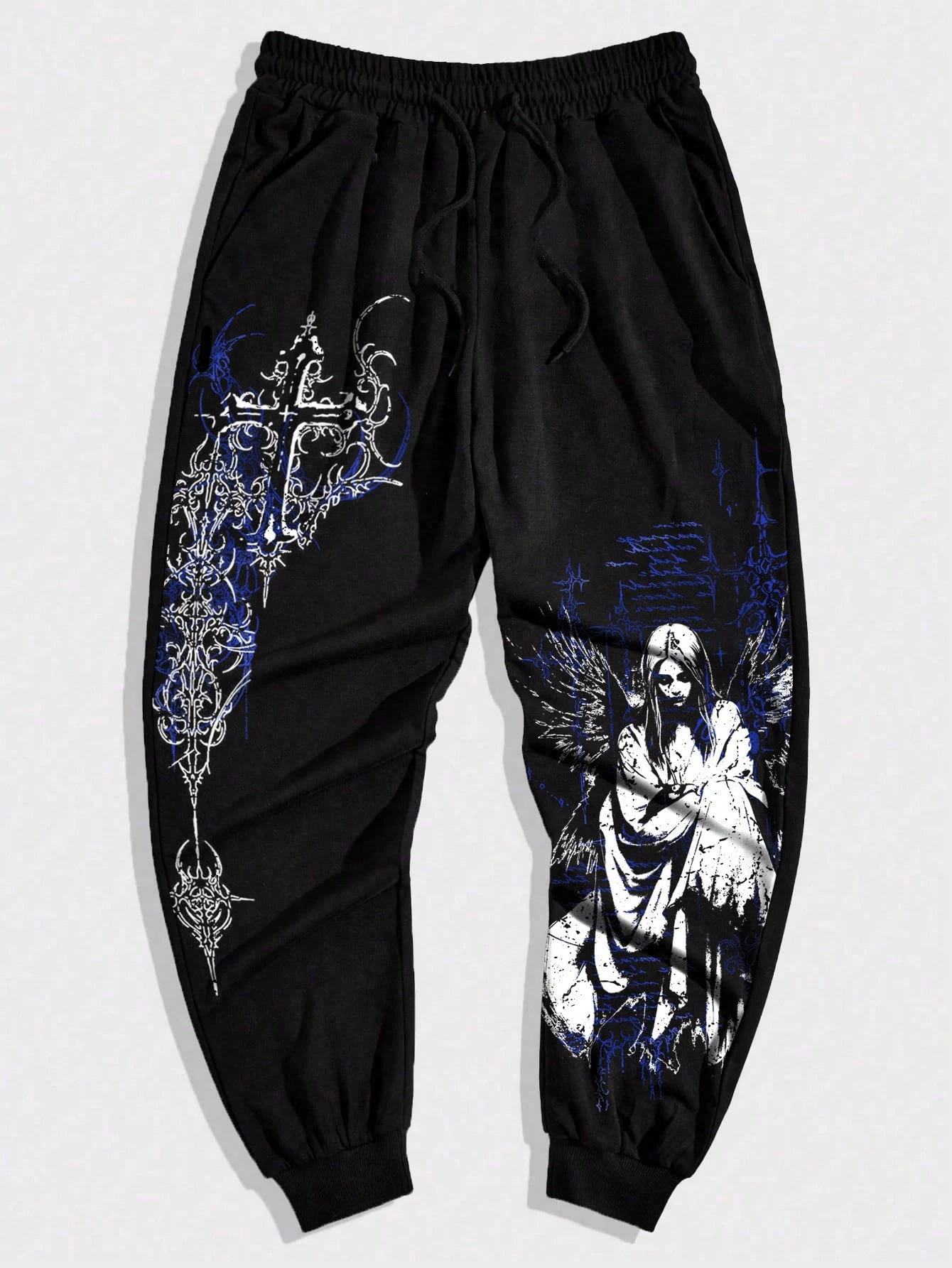 Goth Men's Cross Print Drawstring Waist Pockets Jogger Pants