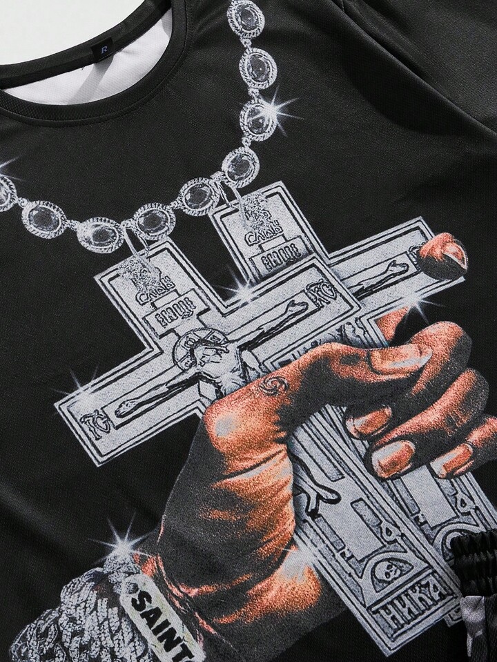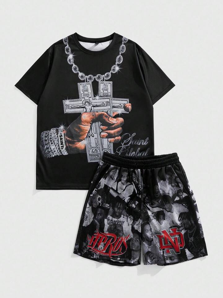 Goth Men's Cross Print T-Shirt & Graphic Print Shorts Set