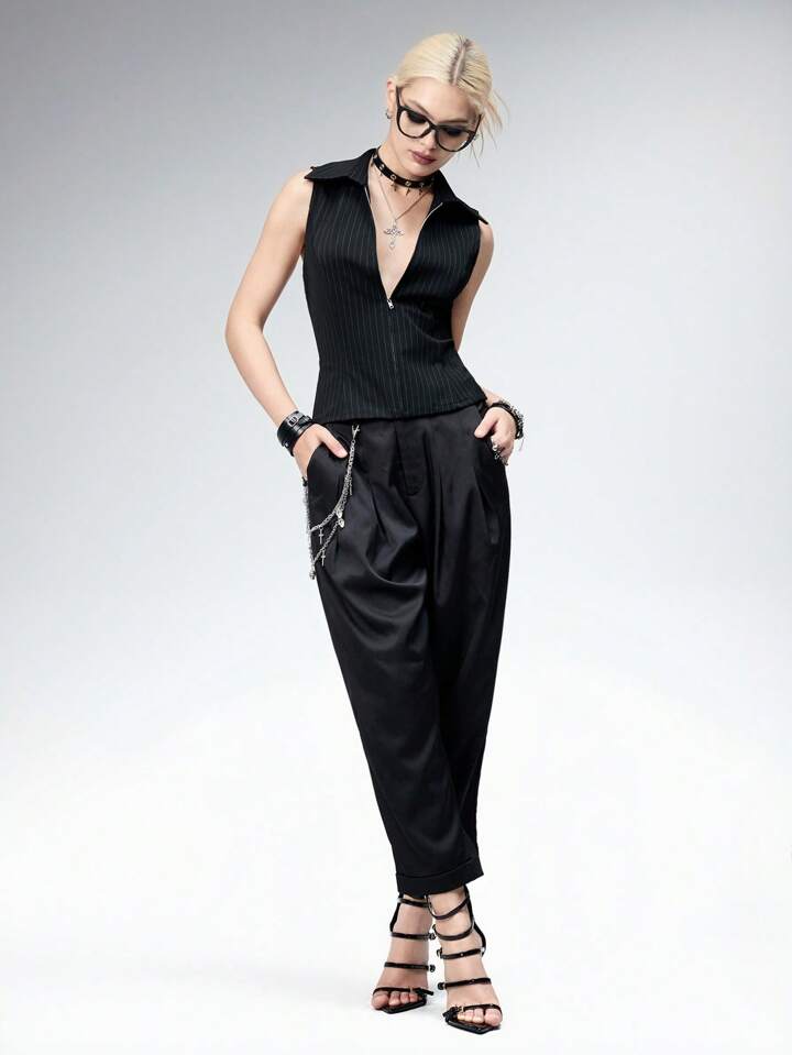 Goth Mermaid Style Deep V-Neck Striped Slim Fit Vest Shirt For Office Wear