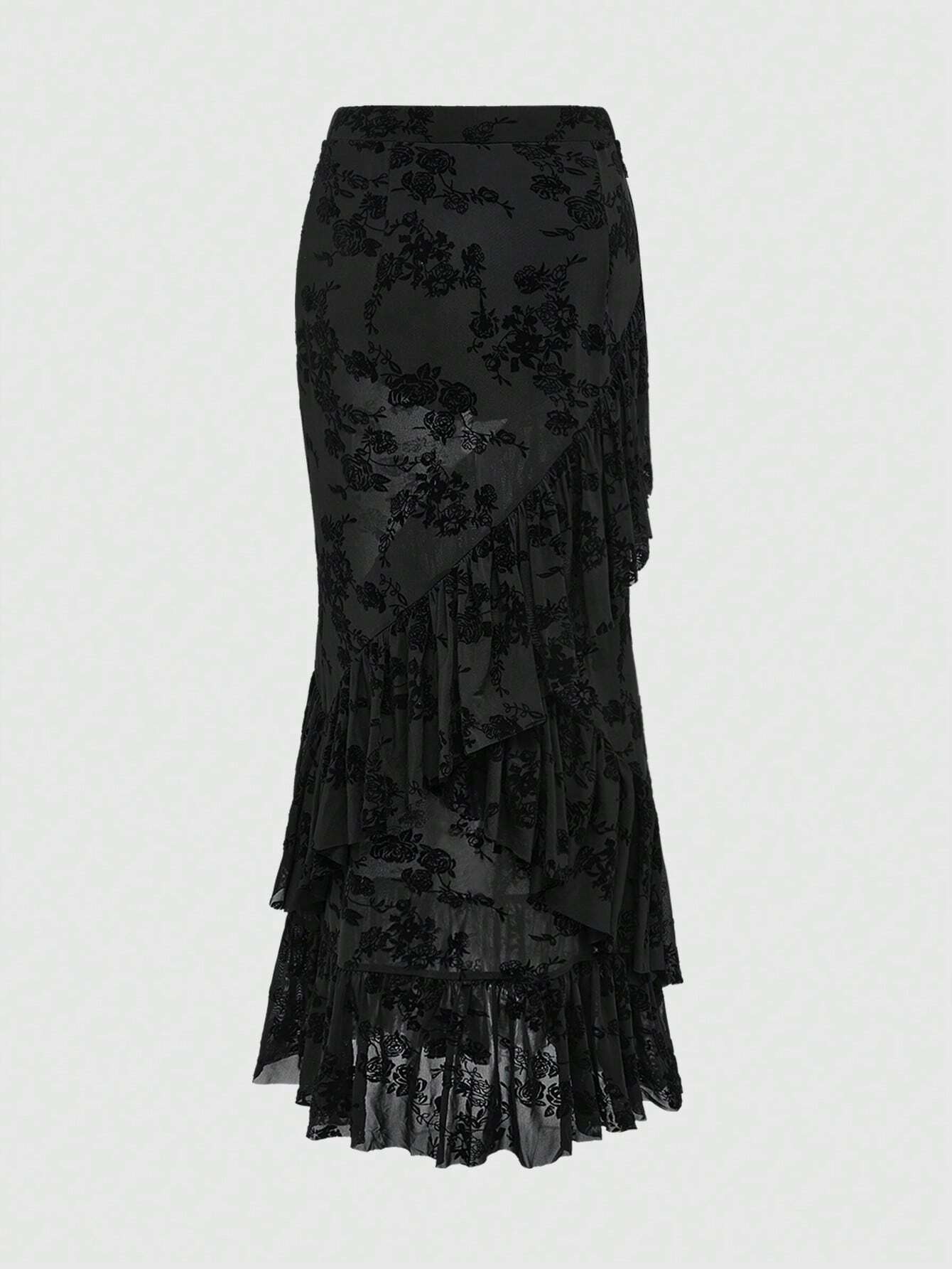 Goth Mesh & Velvety Rose Floral Pattern See-Through Sexy Women Skirt With Ruffle Hem Design, Mid-Length, And Hip-Hugging Fit