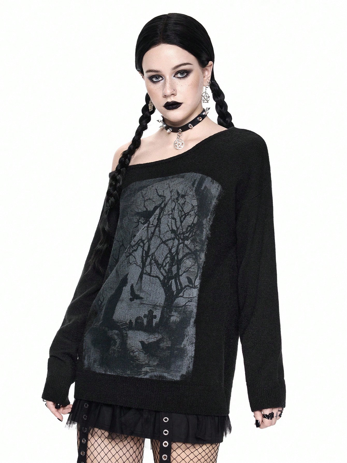 Goth Oversized Mysterious Cat, Bare Tree, Bat Silhouette Print Asymmetrical Neck Long Sleeve Knit Sweater, Halloween