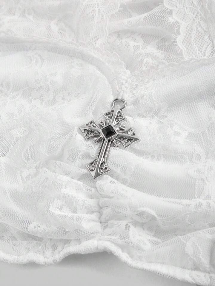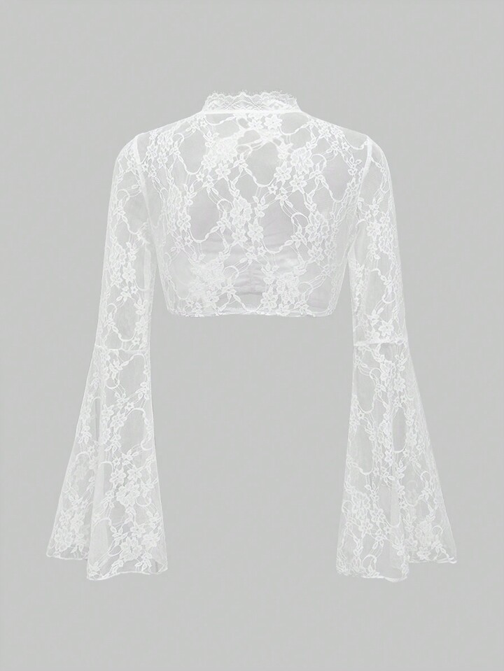 Palace Elegant Vintage Gothic Ball Sheer Lace Floral Hem Cross Flare Sleeve Women Blouse