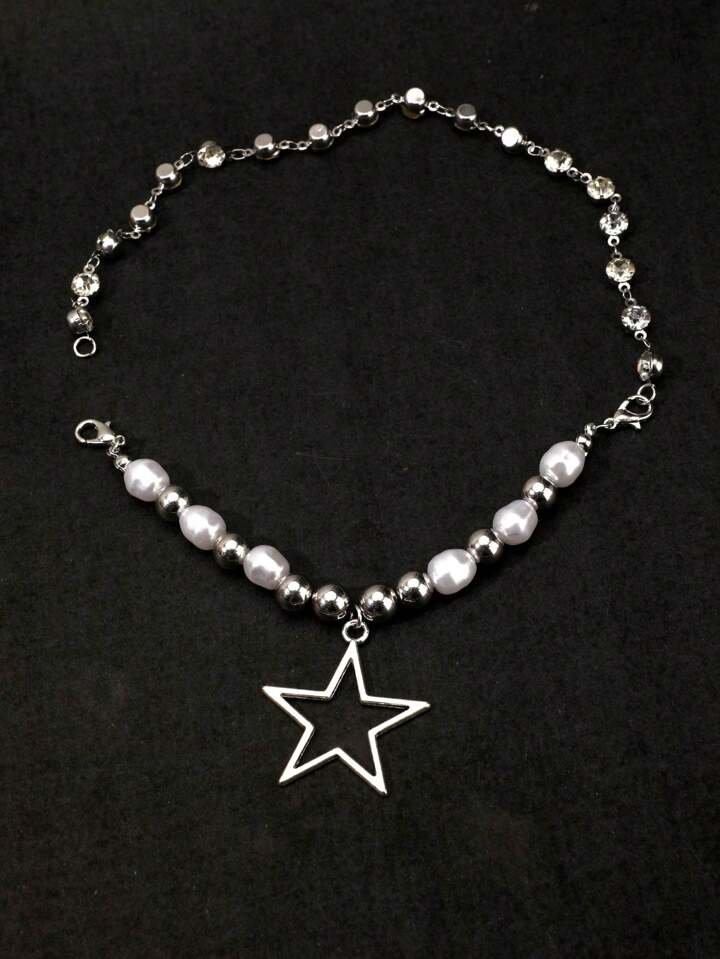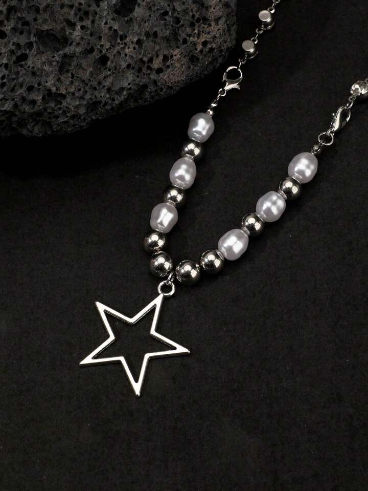 Goth Pearl Beaded Necklace With Star Pendants, Y2k Style Star & Asymmetrical Shaped Chain Necklace, Ins Fashion