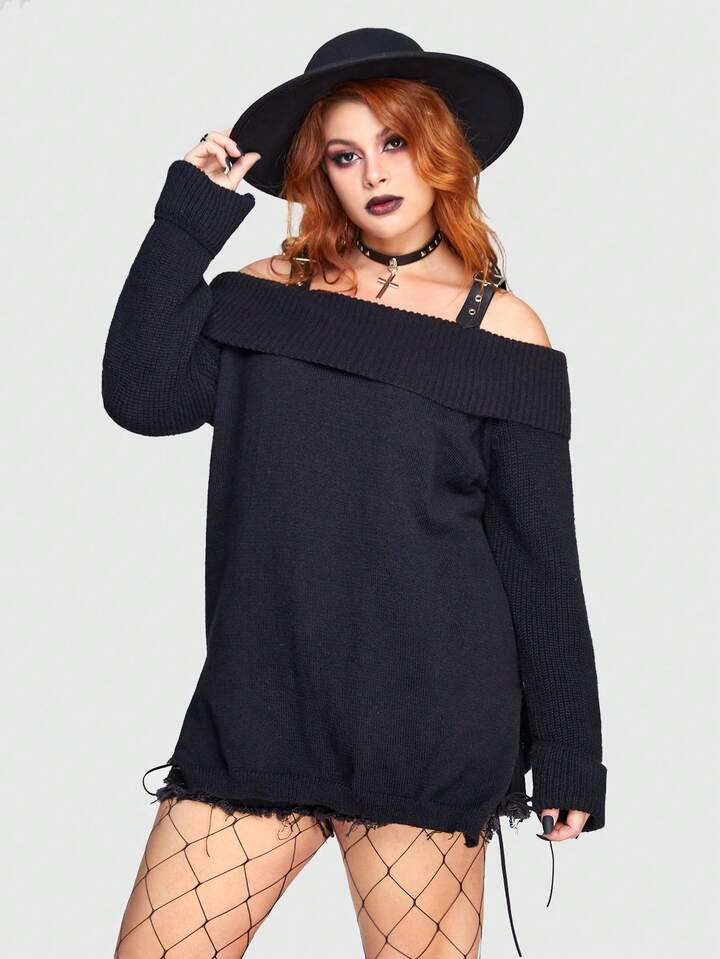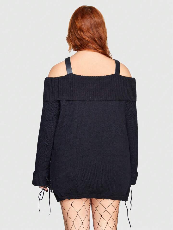 Goth Plus Cold Shoulder Lace Up Side Sweater