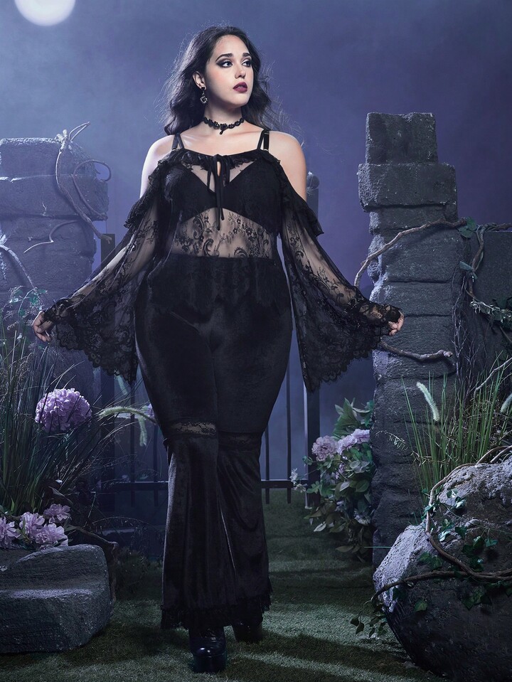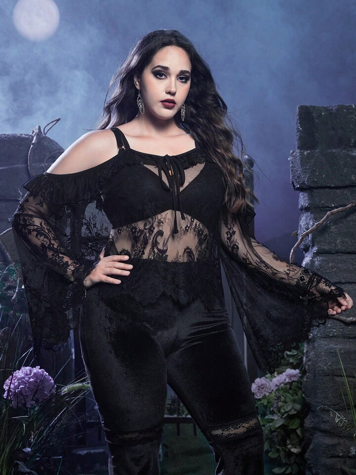 Goth Plus Cold Shoulder Ruffle Trim Lace Top Without Bra