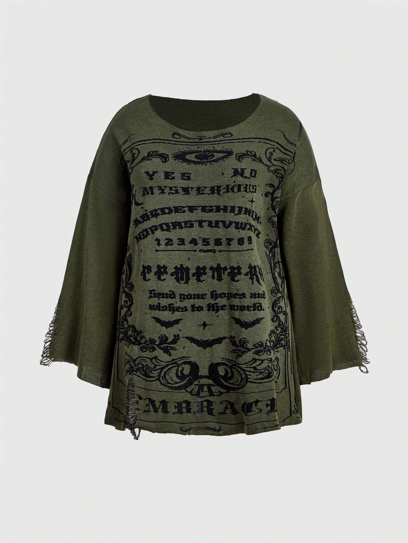 Goth Plus Eye & Slogan Pattern Drop Shoulder Ripped Sweater