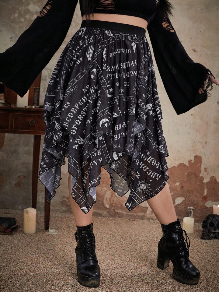 Goth Plus Letter Graphic Hanky Hem Mesh Skirt