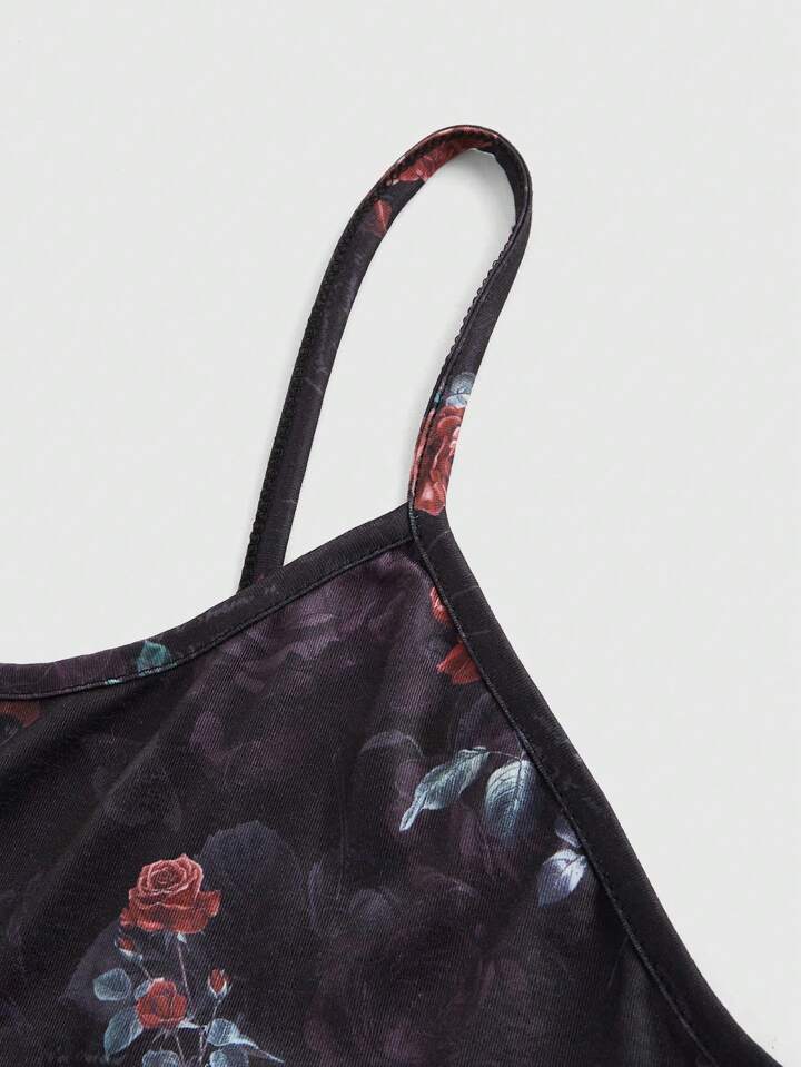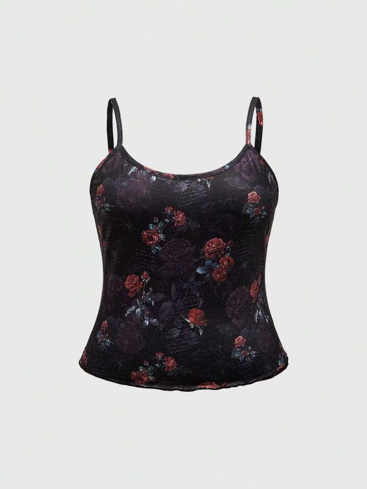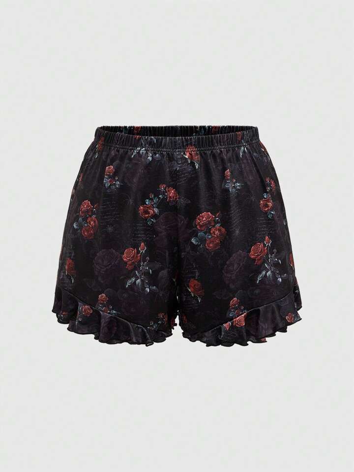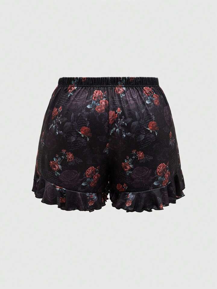 Plus Size Oil Painting Rose Flowers & Spider Gothic Font Print Cami & Ruffle Shorts Pajama Set
