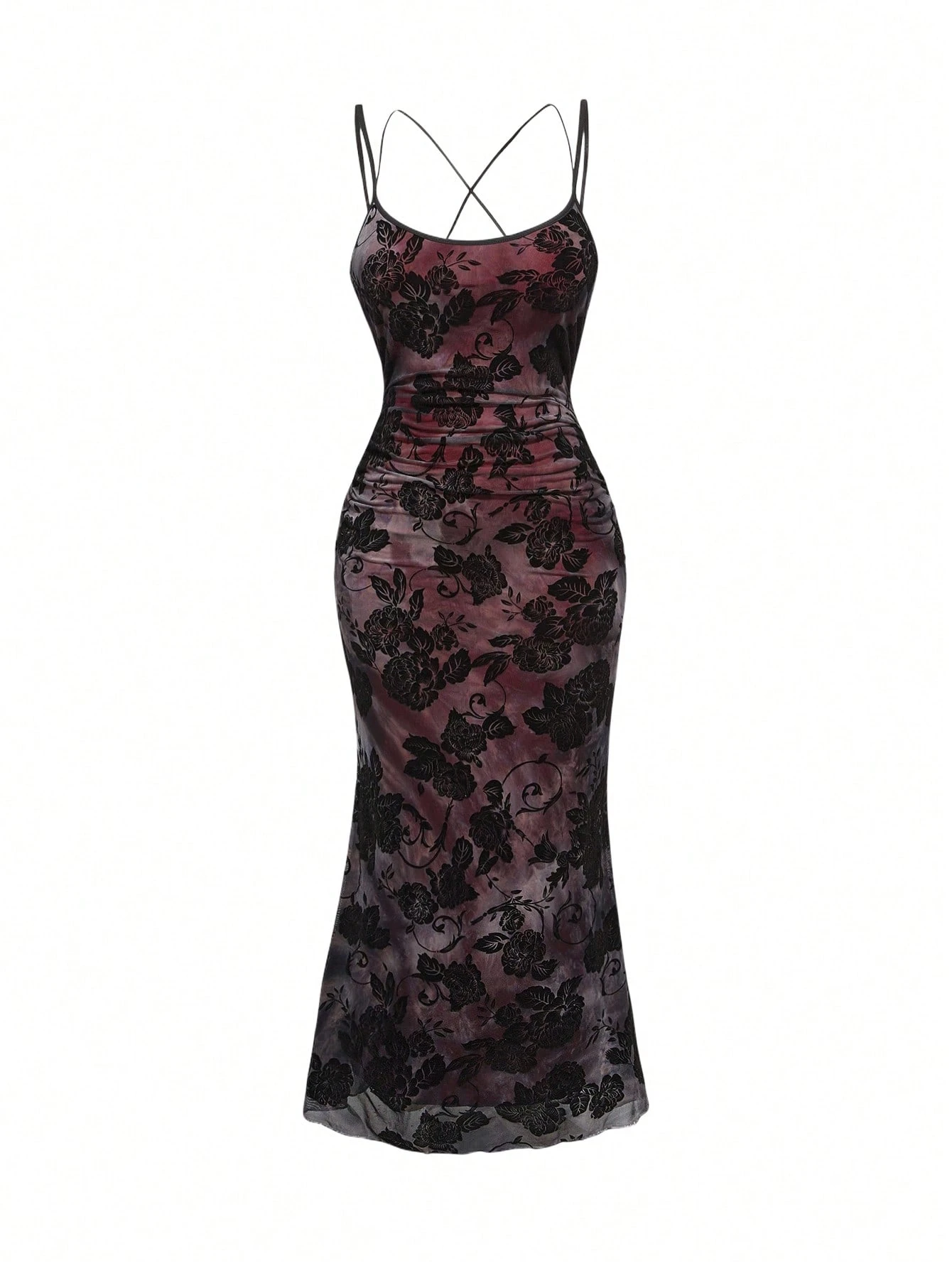 Goth Plus Size Retro Floral Flocked Backless Waist Fitted Mermaid Dress