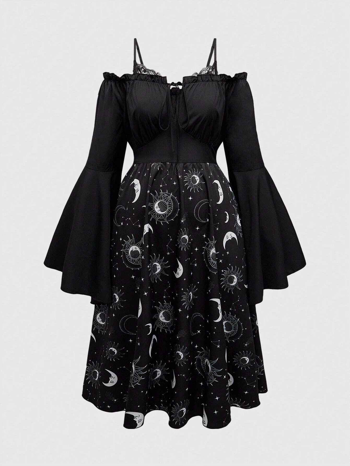 Goth Plus Size Romantic Vintage Halloween Sun Moon Star Mysterious Flare Sleeve Dress