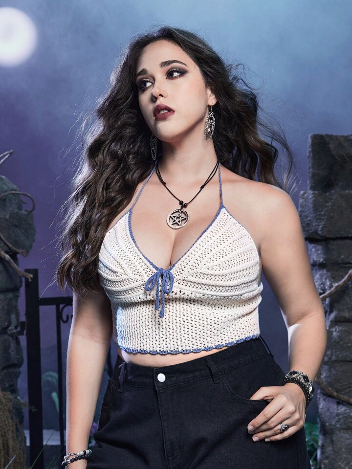 Goth Plus Size Summer Crochet Tie Front Tie Backless Halter Knit Top