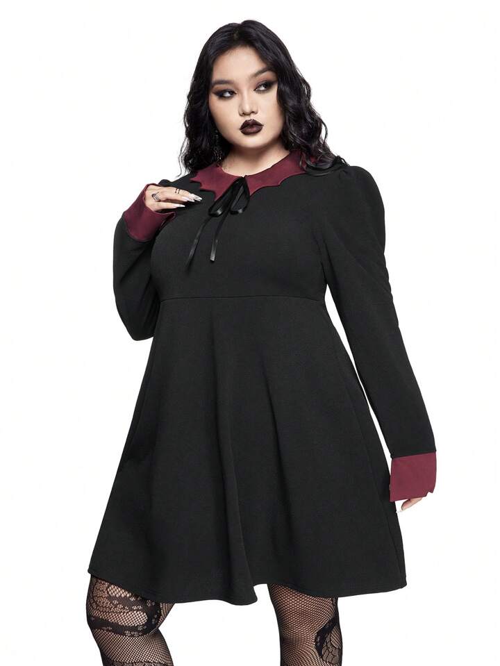 Plus Size Women Gothic Style Bat Collar Tie-Up Color Block A-Line Waist Dress