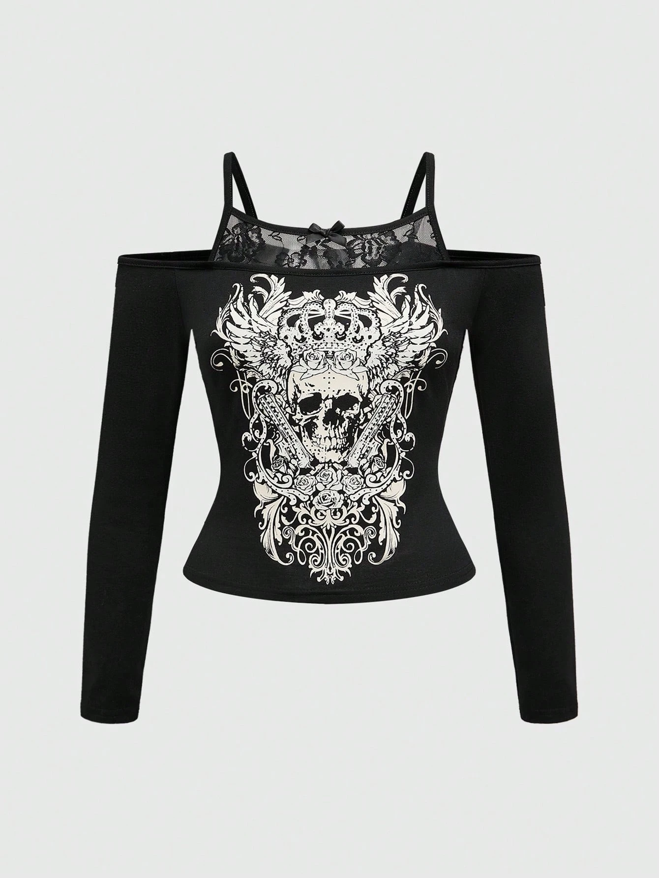 Goth Plus Size Women Skull & Pistol Floral Print Rhinestone Lace Patchwork 2 In 1 T-Shirt, PUNK Style