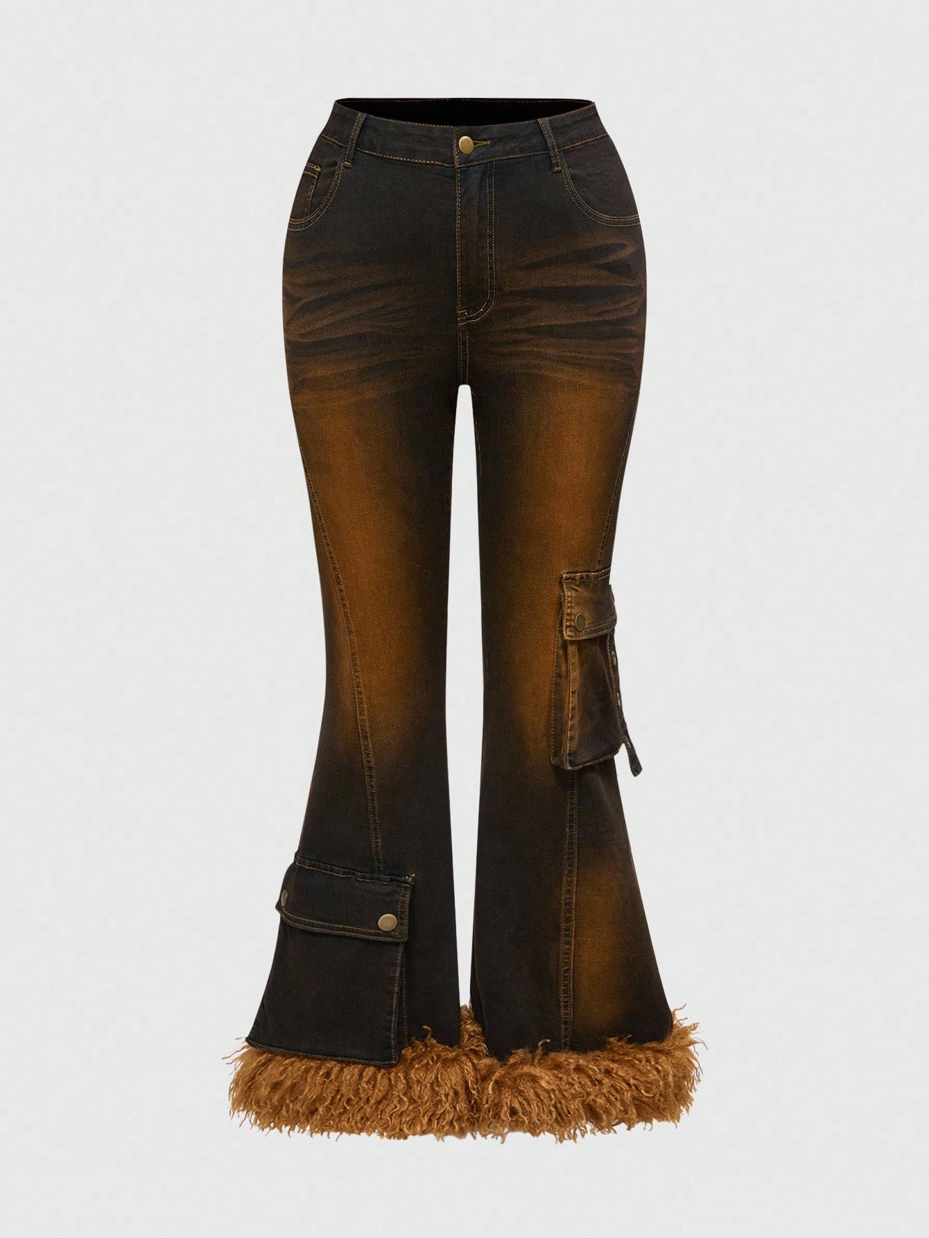 Goth Plus Size Women Vintage Washed Brown Slim Fit Flare Leg Jeans, Grunge-Punk, Distressed Details, School, Plus Size Women Jeans, Cargo Pockets, Flare Leg Patchwork Fleece Long Brown Regular Fit Plus Size Women Jeans, Spring Autumn, Autumn Winter Plus Size Women Bottoms, Casual Daily Wear