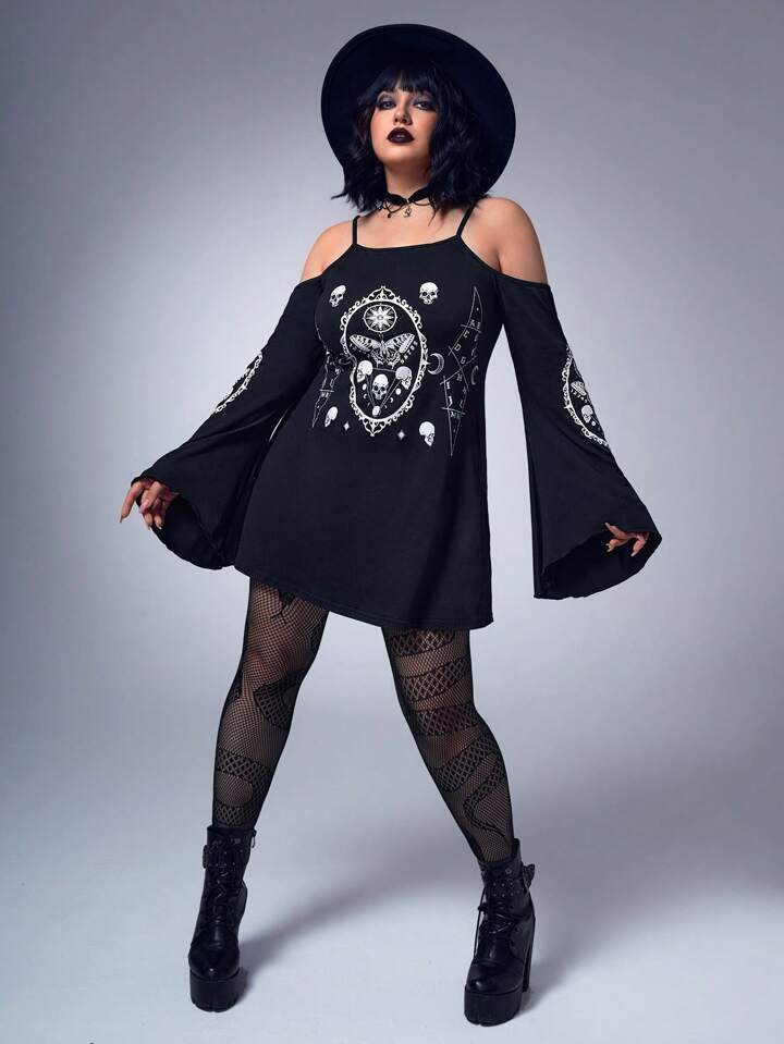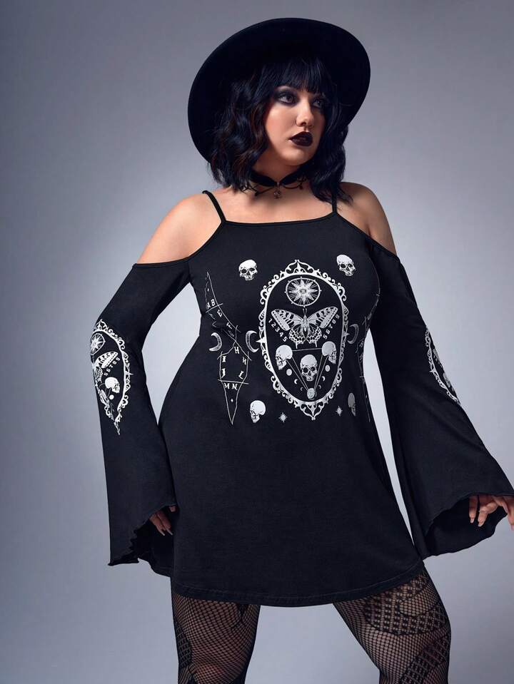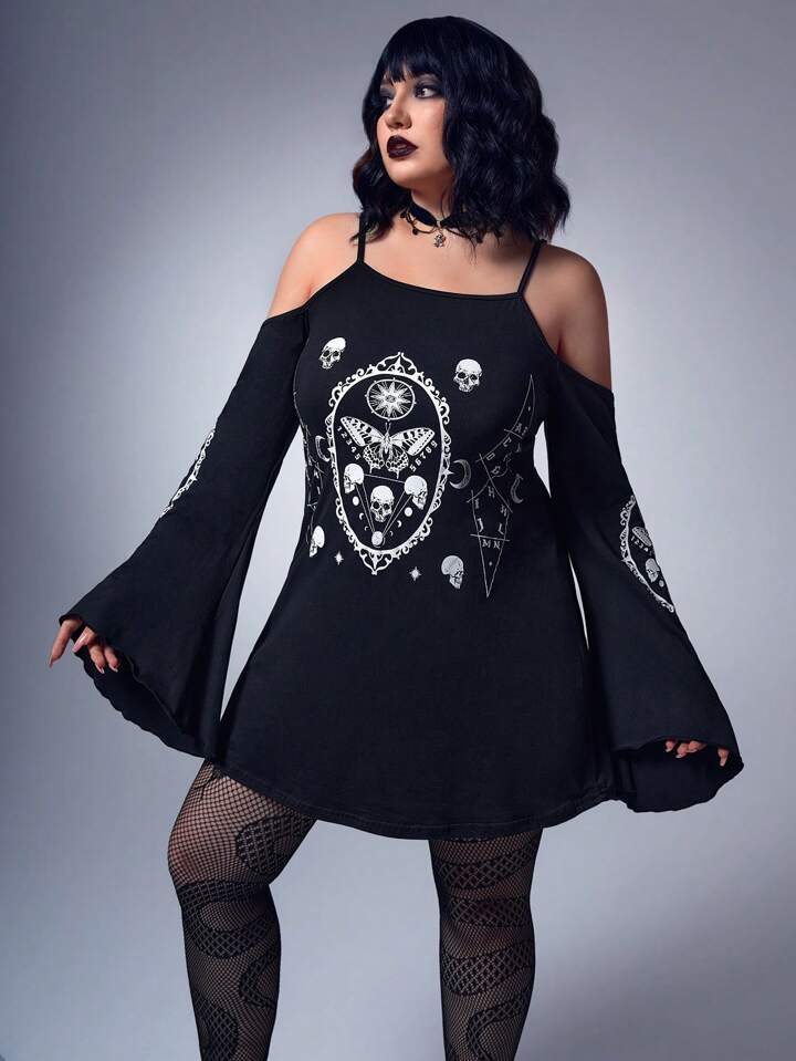 Goth Plus Skull Print Cold Shoulder Flounce Sleeve Dress