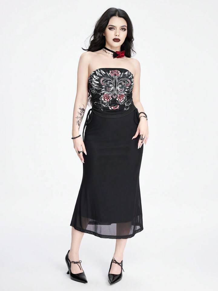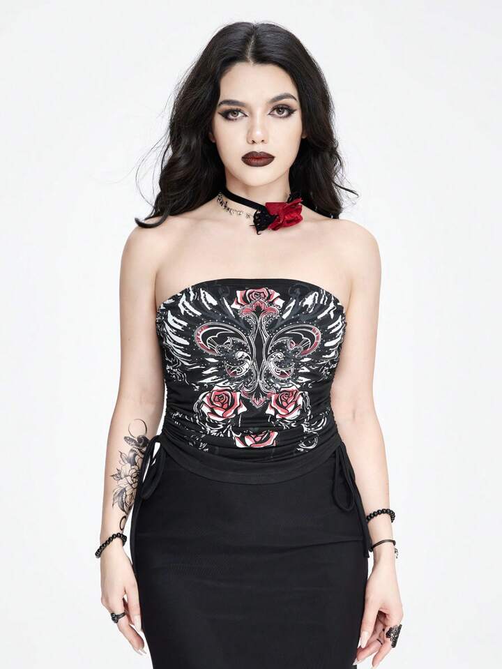 Goth Printed Rhinestone Bandeau Top With Drawstring For Women