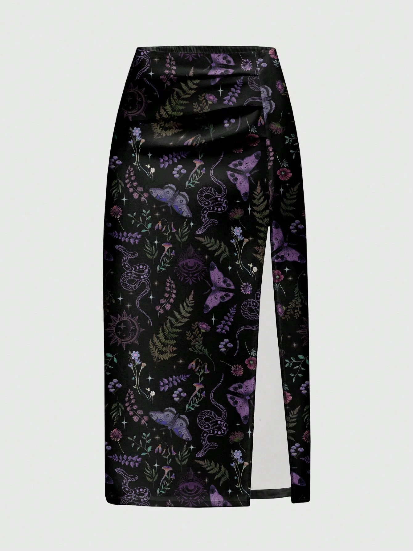 Goth Purple & Black Mysterious Dark Floral, Sun, Moon, Star, Butterfly & Snake Print High Slit Skirt For Women