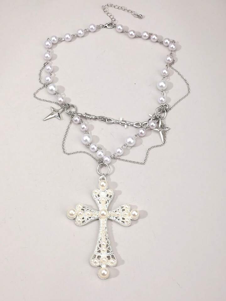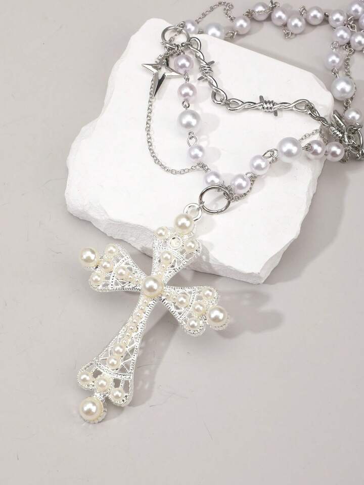 Goth Rhinestone Embellished Large Cross & Faux Pearl Multi-Layer Necklace For Women