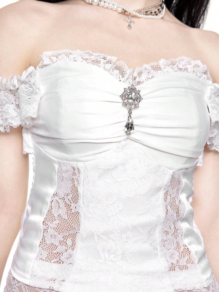 Goth Romantic Wedding Season Contrast Lace Elastic Off Shoulder Fitted Ladies Top, Palace Style