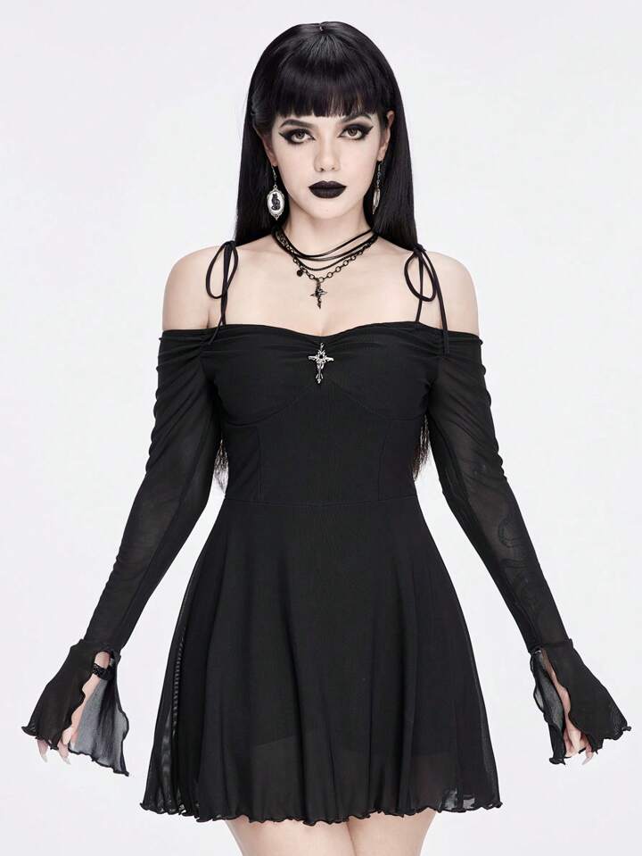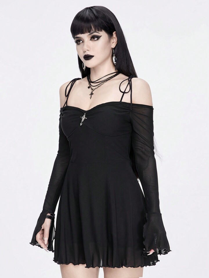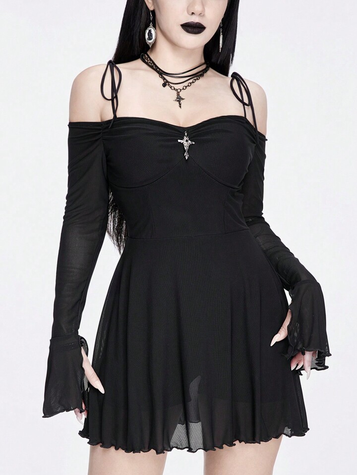 Goth Sexy Cold Shoulder Cross Mesh Bodycon Dress With Twist Knot And Cross Pendant, For New Year