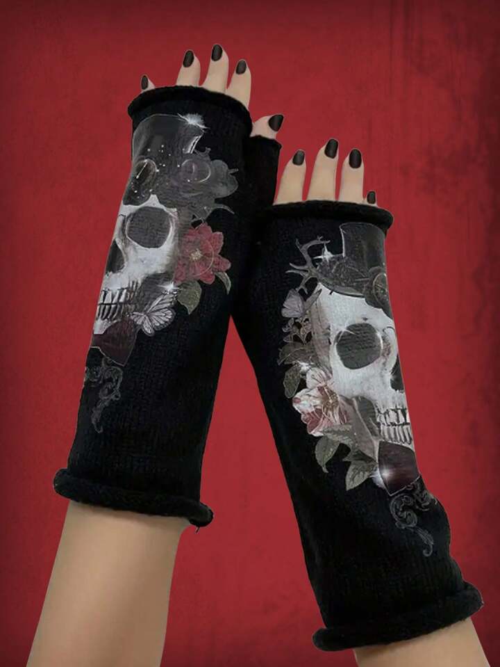 Goth Skull Beanie With Knitted Gloves & Elastic Half Finger Glove, Unisex Gift