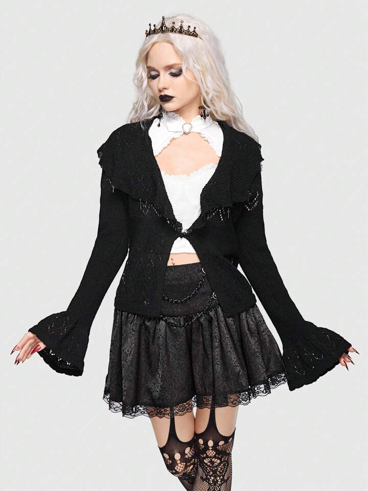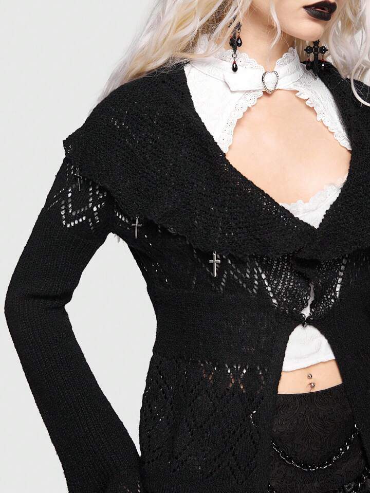 Goth Solid Flare Sleeve Cross Detail Cardigan