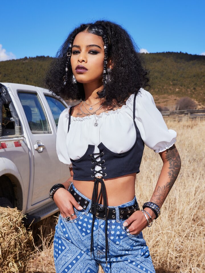 Goth Solid Lace Up Top & Ruched Bust Crop Top