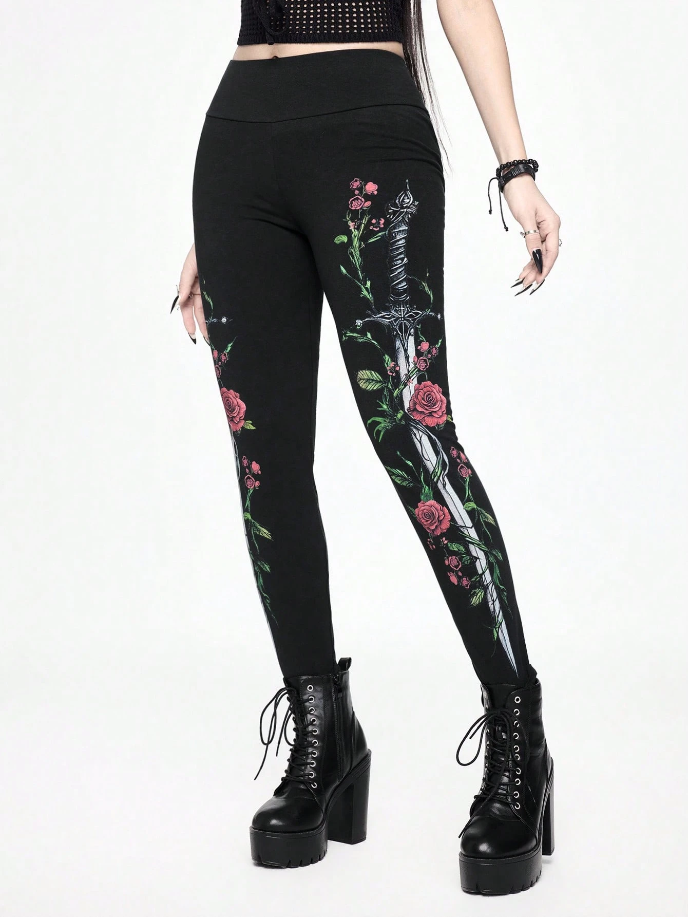 Goth Spring/SummerWomen's Dark Forbidden Forest Sword Rose Floral Print Leggings