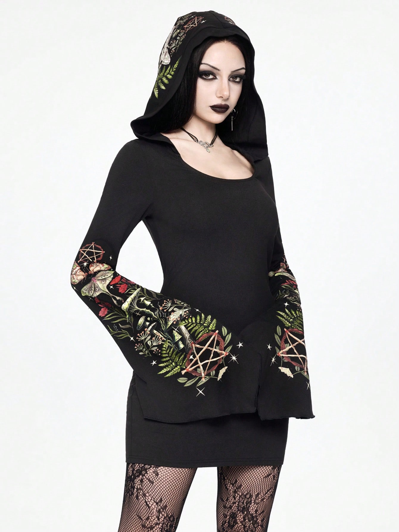 Goth Spring/SummergraphicblackHooded Flare Sleeve Mushroom & Moth Print Bodycon Mini Dress For Women
