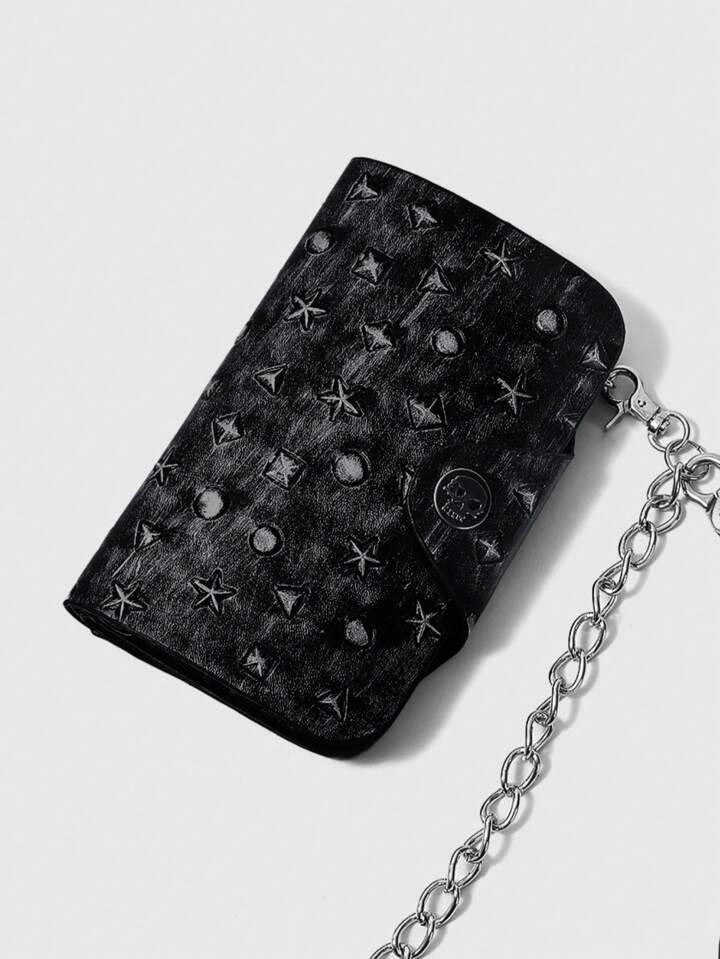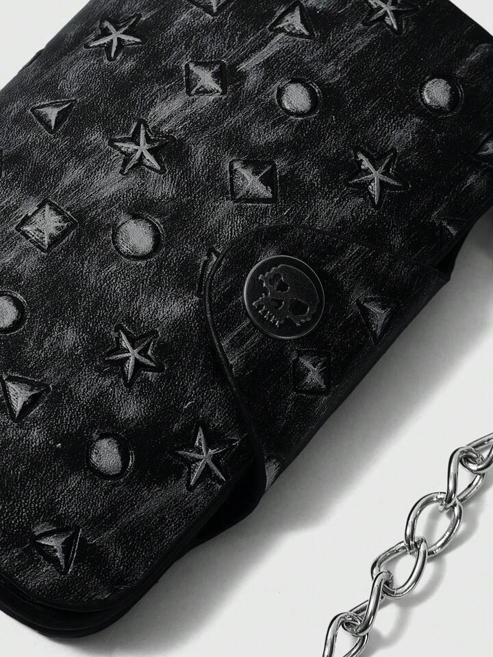 Goth Star Printed Long Wallet With Anti-Theft Skull Head Metal Chain Punk Rivets Decor Long Black Purse