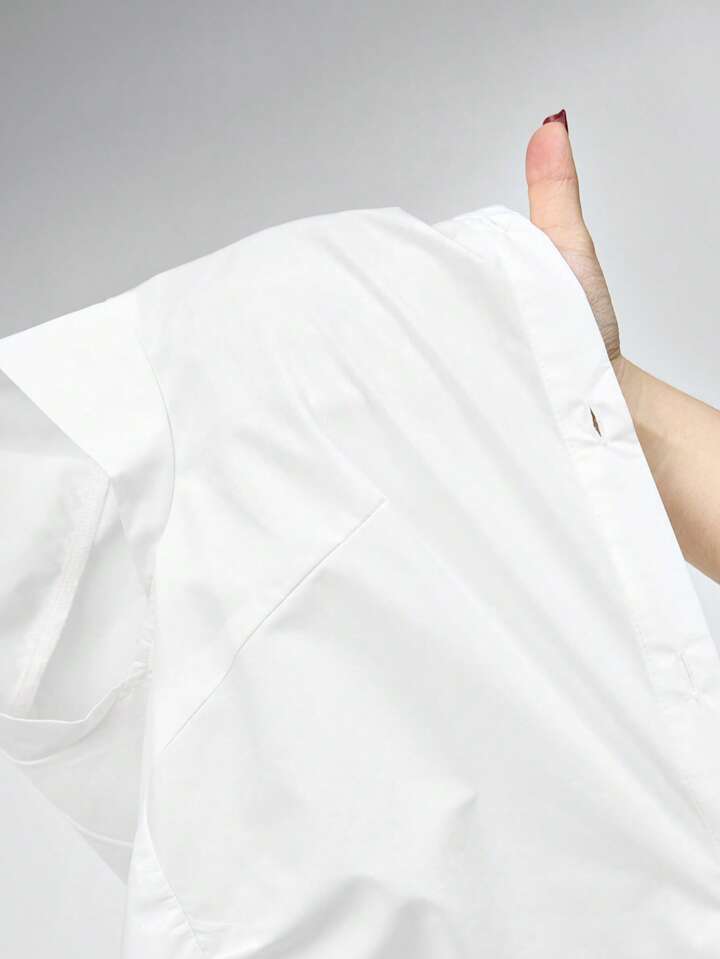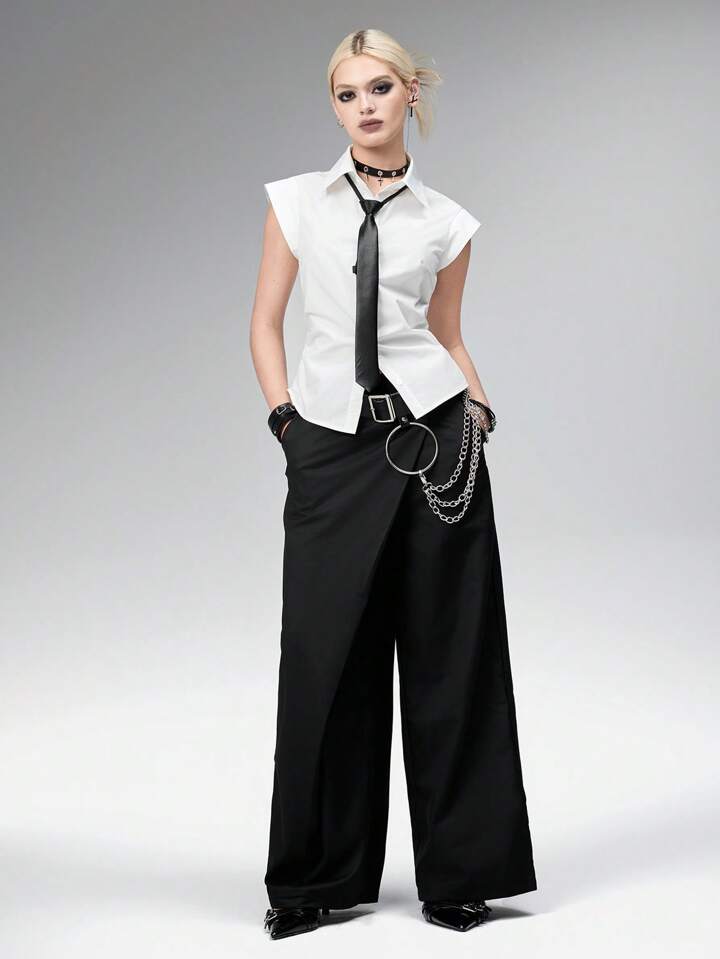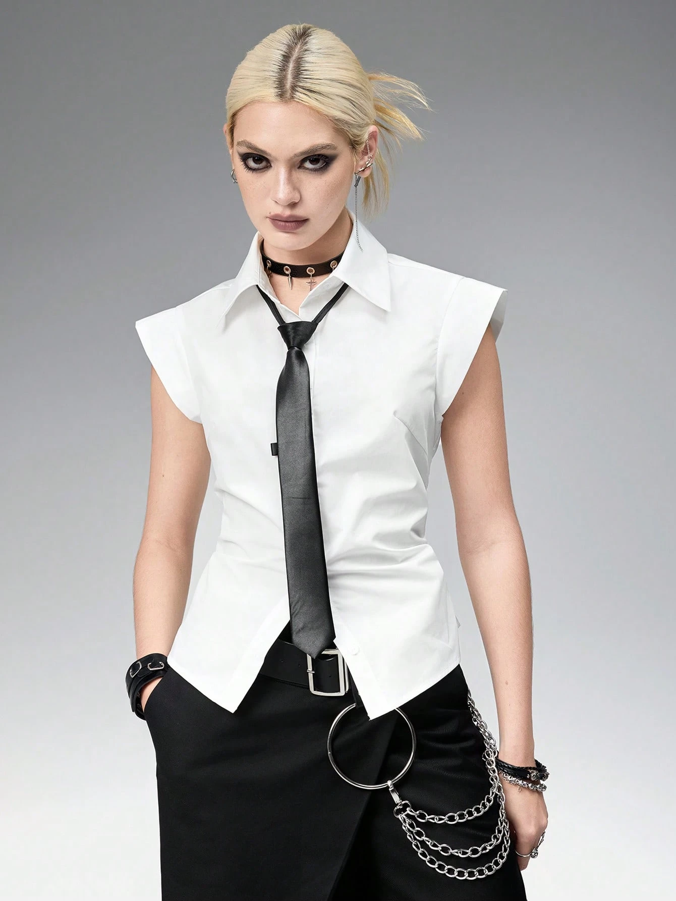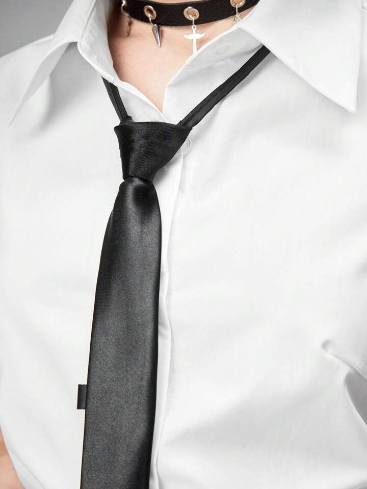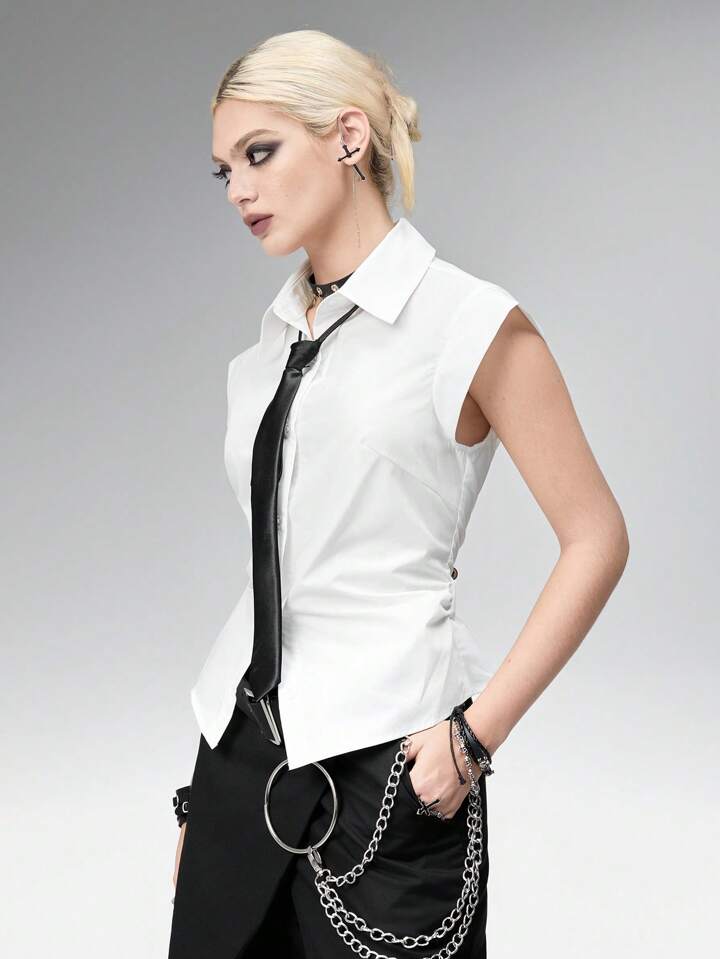 Goth Style White Fitted Waist Blouse & Tie For Women, Professional