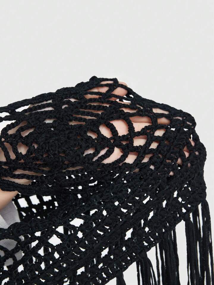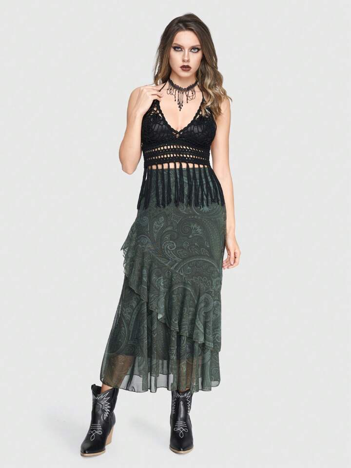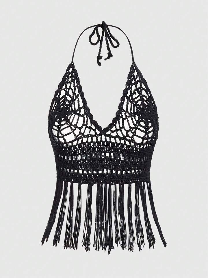 Goth Summer Crochet Beach Holiday Knitted Top With Spider Web Design, Fringed Hem, Open Back And Halter Neckline