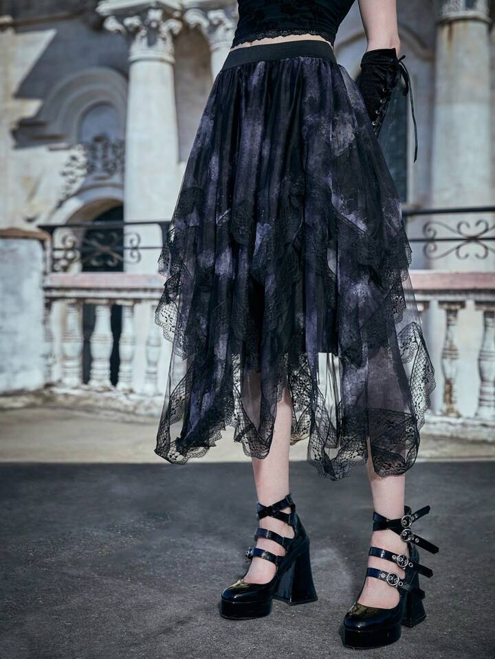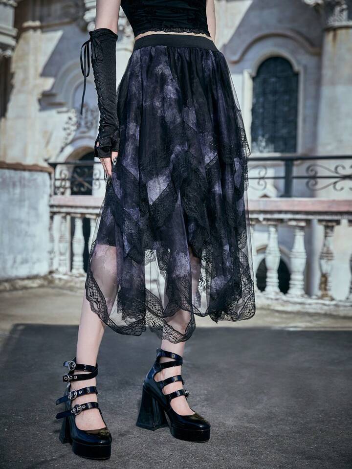 Goth Tie Dye Contrast Lace Asymmetrical Hem Mesh Skirt